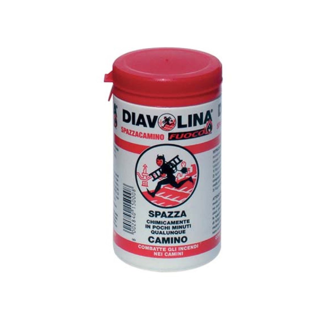 Antifuliggine spazzacamino DIAVOLINA FUOCO Pulitore che elimina chimicamente la fuliggine e le incrostazioni dalla canna fumaria di camini e stufe. Può essere utilizzato con qualsiasi tipo di camino, stufa o cucina. Aumenta il potere riscaldante e aiuta a prevenire gli incendi se usato con regolarità. La sua efficacia è caratterizzata dall'uscita di una fumata bianca dal comignolo, segnale dell'azione spazzacamino.