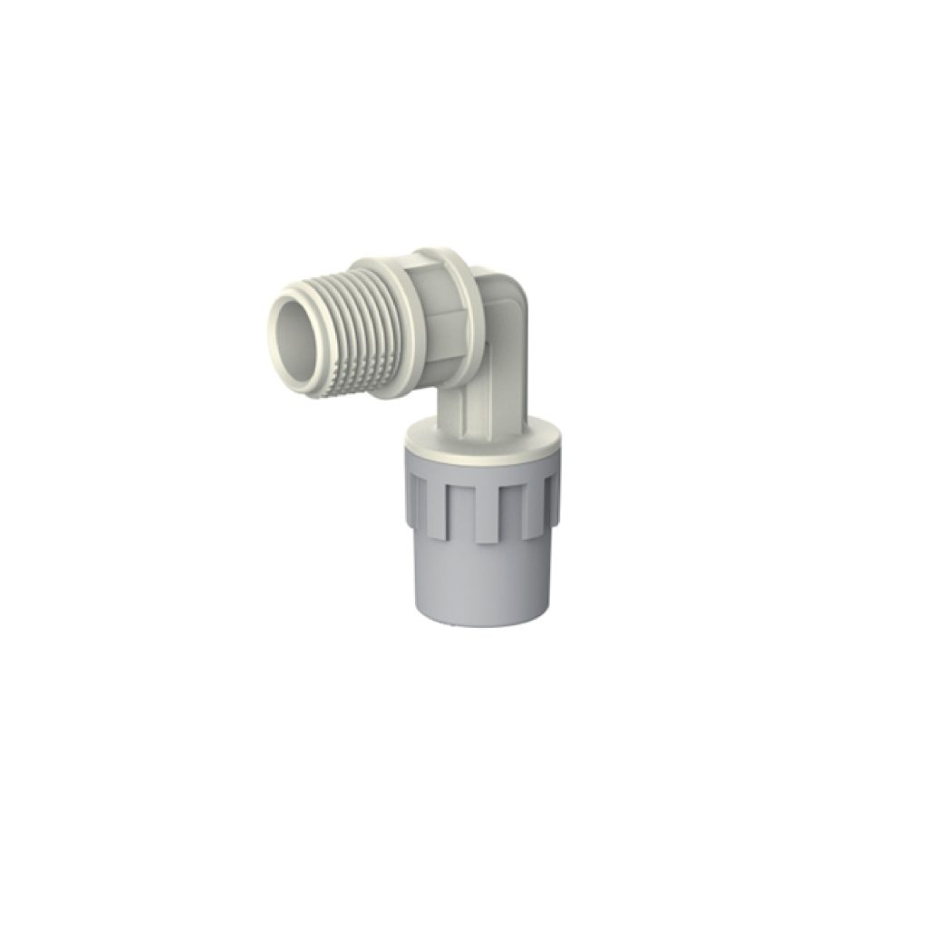 AQUATECHNIK gomito a 90° filettato maschio Safety con filetto in PPS. Sistema adatto alla veicolazione di fluidi ad una temperatura massima in esercizio continuo di 95°C ad una pressione massima di 10 bar. Adatto al contatto con acqua potabile.