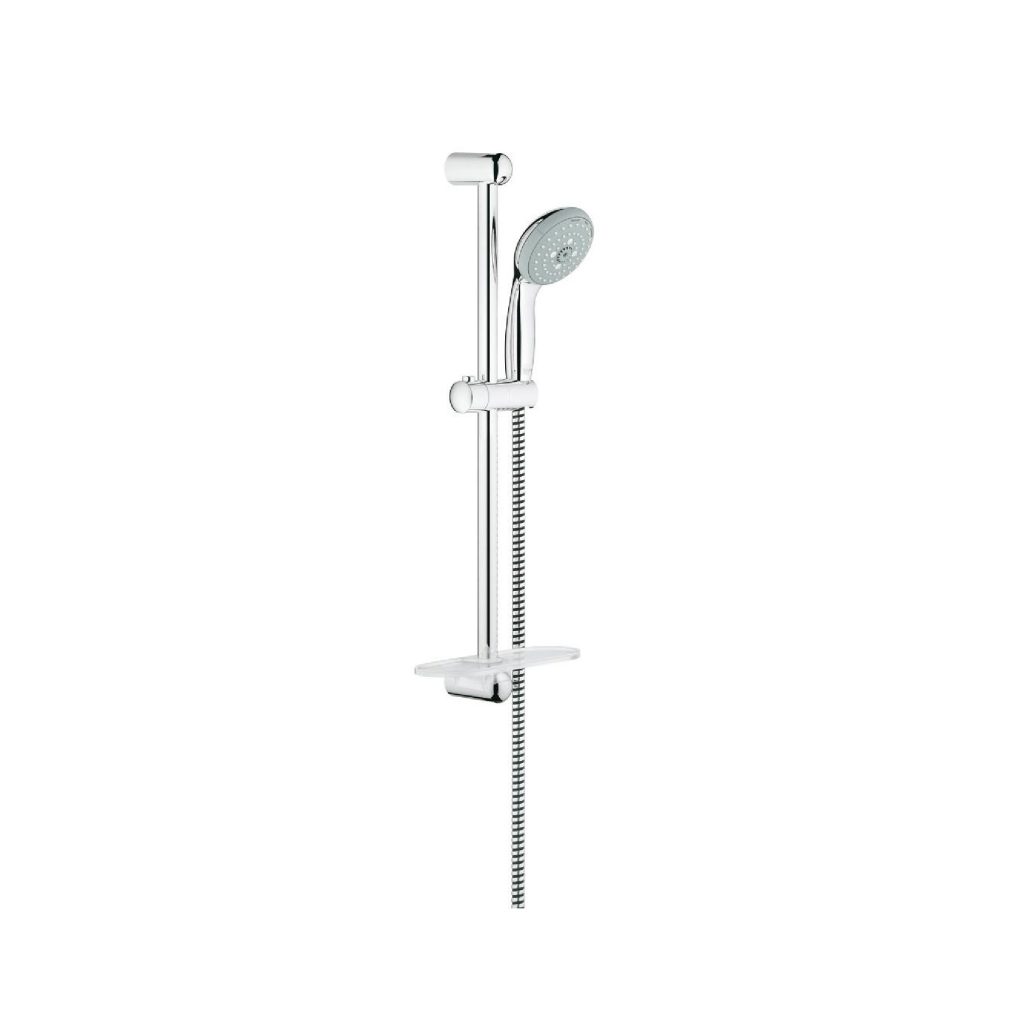 Set doccia GROHE New Tempesta 100 è un kit completo costituito da una manopola doccia, un flessibile, asta doccia da 600 mm e pratica mensola per tenere sempre docciaschiuma e shampoo a portata di mano. Il soffione di lusso consente di scegliere tra tre tipologie di getto: getto Rain per vivere la sensazione di una pioggia tonificante, Rain O2 un po' più dolce con acqua addizionata di bolle d'aria e il getto Massage con il suo flusso d'acqua pulsante per un effetto rilassante. GROHE DreamSpray® garantisce una distribuzione uniforme dell'acqua a tutti gli ugelli per una sensazione ottimale. Grazie a SpeedClean® è possibile rimuovere il calcare dal soffione semplicemente con un dito. EcoJoy® è la tecnologia che consente di ridurre il consumo idrico fino al 50%. Il soffione è dotato anche del rivestimento protettivo in silicone ShockProof per proteggere soffione e piastrelle in caso di caduta. Il soffione ha una splendente finitura cromata GROHE StarLight® di facile manutenzione.