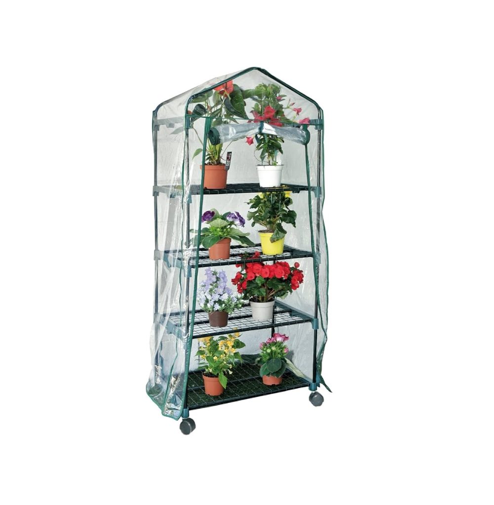 Serra rapida ROLLY maxy cm 70x50x160 h in acciaio verniciato e giunti in plastica, dotata di ruote per un facile spostamento, quattro ripiani che supportano un peso fino a 10 kg e telo in pvc con filtro UV. Montaggio rapido senza attrezzi chiusura con cerniera